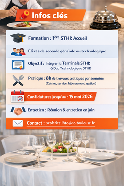 Par admin hotellerie-tourisme, publié le lundi 9 mars 2026 17:22 - Mis à jour le lundi 9 mars 2026 17:22Le Lycée des Métiers de l’Hôtellerie et du Tourisme d’Occitanie à Toulouse propose une classe de 1ère STHR Accueil, destinée aux élèves issus d’une seconde générale ou technologique souhaitant s’orienter vers les métiers de l’hôtellerie et de la rest -