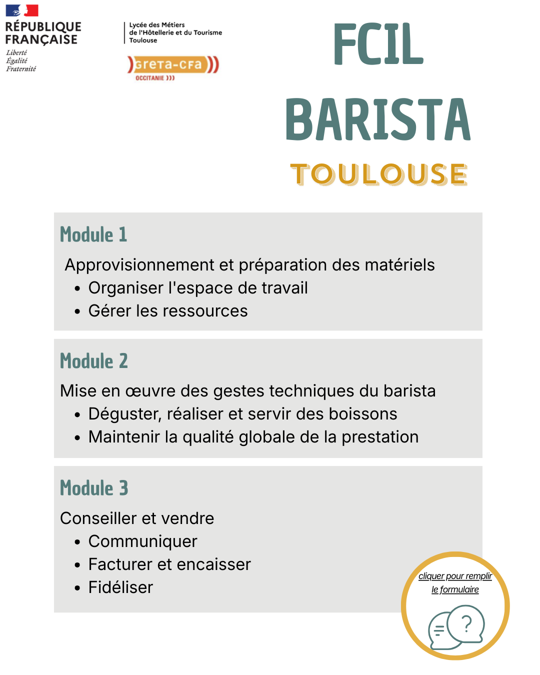 Le lycée des métiers de l’hôtellerie et du tourisme d’Occitanie à Toulouse ouvre, à la rentrée prochaine, une Formation Complémentaire d’Initiative Locale (FCIL) Barista.