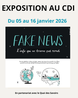 Par VERONIQUE ROYER, publié le lundi 12 janvier 2026 10:16 - Mis à jour le lundi 12 janvier 2026 10:23N'hésitez pas à venir découvrir cette exposition et à réserver le CDI . Un questionnaire et un atelier pédagogique sur les Fake News sont proposés à cette occasion. -