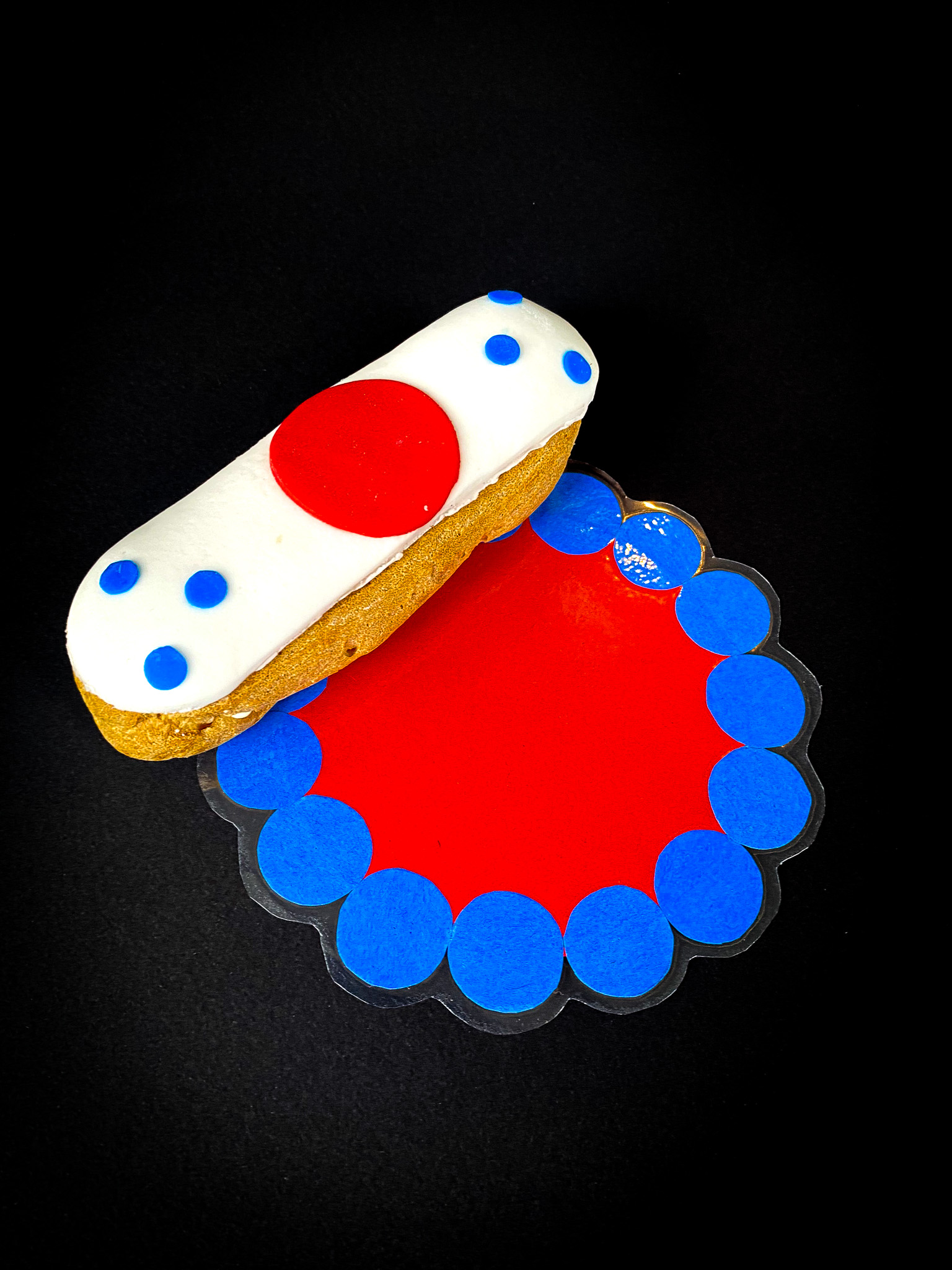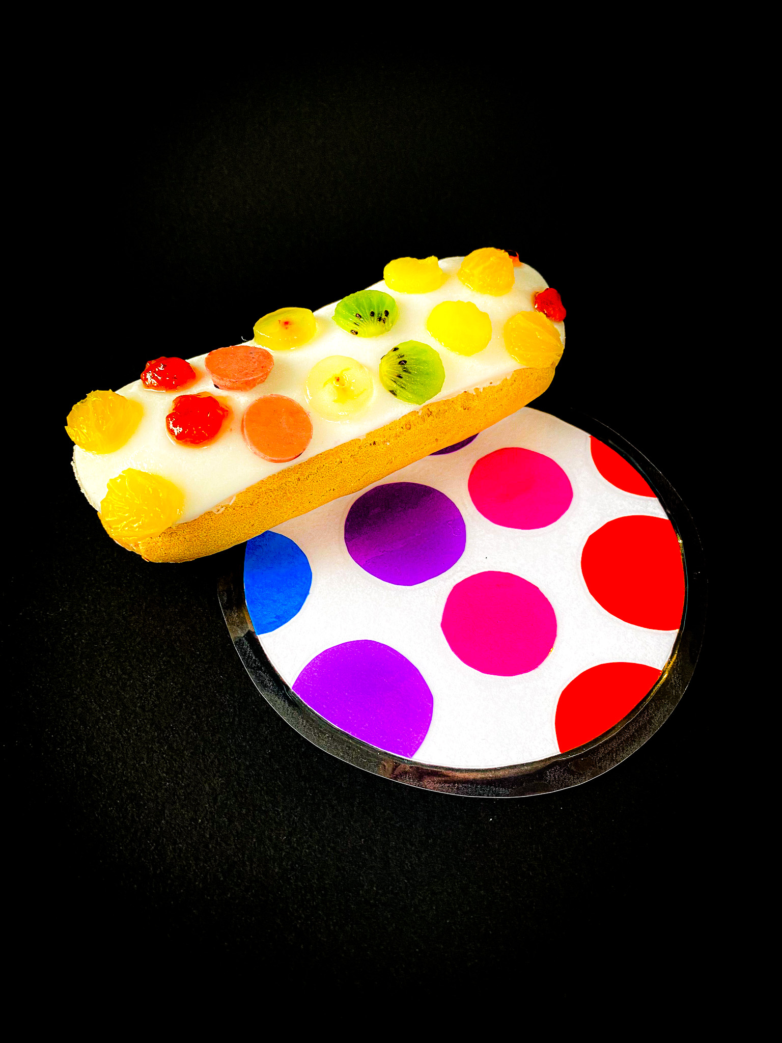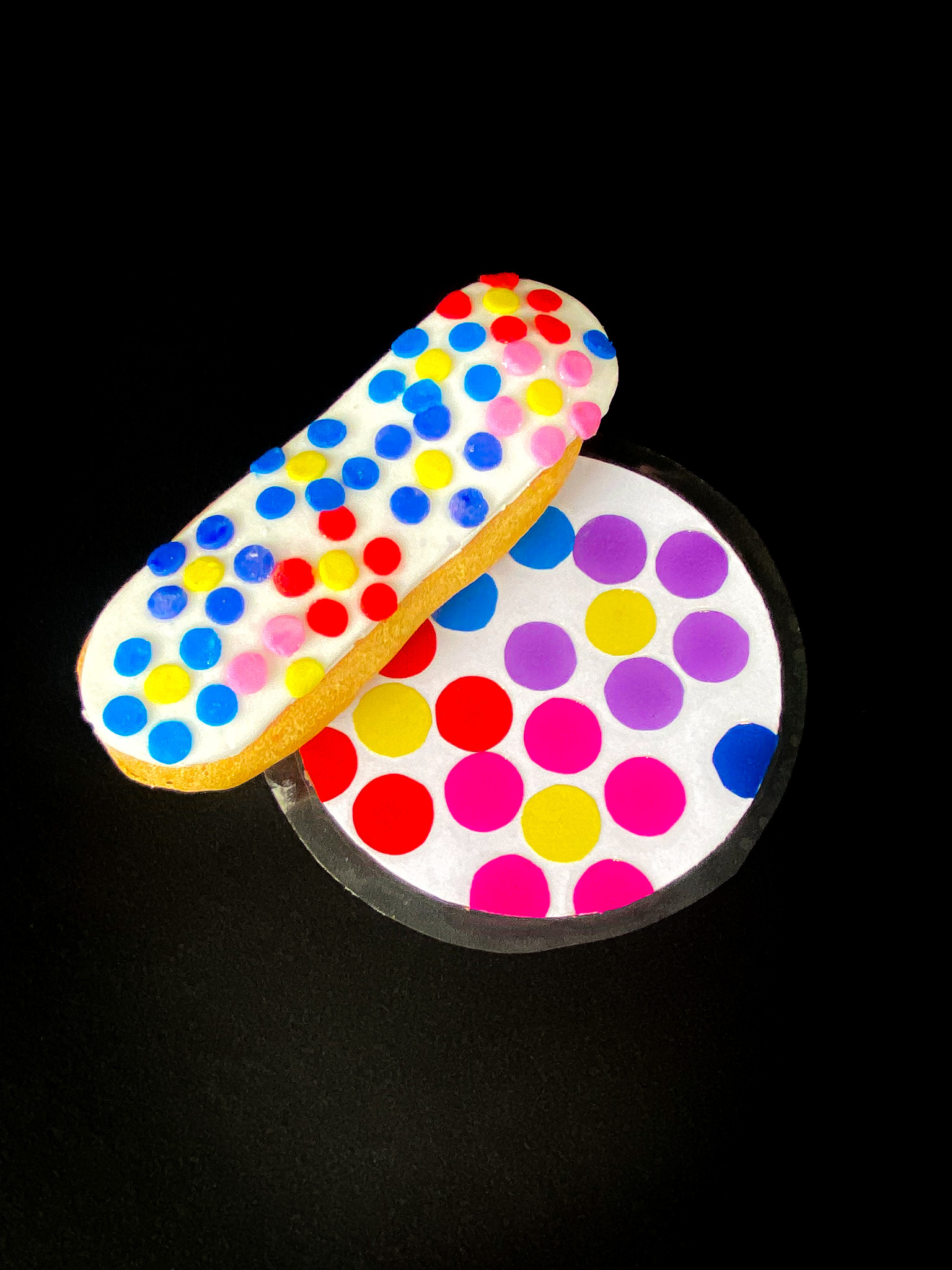 Le projet s’est prolongé avec la création de dessous de verre assortis aux éclairs, réalisés par superposition de cercles colorés. Cette étape a permis de travailler la cohérence graphique, le lien entre 2D et objet, et la mise en scène finale du buffet.